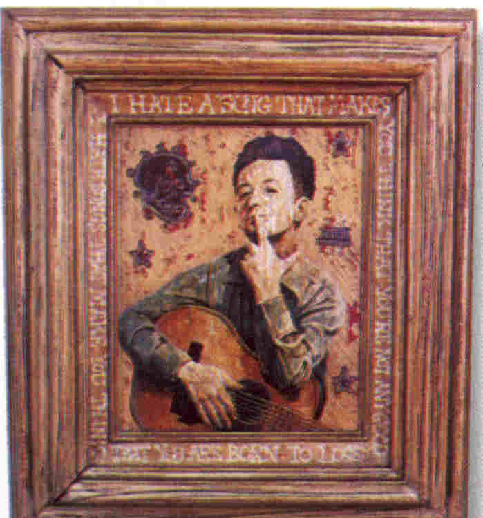 | Mekon Jon Langford, top left, with his rendering of Hank Williams as homoerotic saint, right, plus tragic heroes Woody Guthrie, Bob Wills, Curtis Mayfield. New Langford paintings will debut at the Barbican, London, this year. |